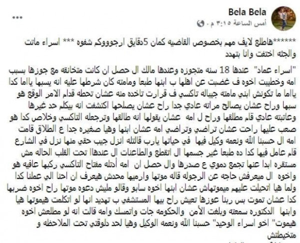 ضجة كبيرة في مصر بسبب قضية إسراء عماد (صورة) - RT Arabic from cdni.rt.com وادعت الكاتبة أنها واحدة من العاملين داخل مستشفى المنصورة الدولي، وأن الفتاة إسراء عماد. ونسبت النيابة العامة إلى المتهم الأول، زوج إسراء عماد، والمتهم الثاني، أحد أقارب المتهم الأول، تهمة الشروع في القتل، وحيازة سلاح أبيض، وهو السلاح المستخدم في الجريمة. السلام عليكم ورحمة الله وبركاته ماشاءالله لا قوة الا بالله البرنامج بيجنن وانا على فكرة جودي عماد اللي مع قروب مروى عبد العزيز وبحبكن كلكن. حقيقة اختفاء جثة إسراء عماد من المستشفى بعد قتلها. Ask anything you want to learn about إسراء عماد by getting answers on askfm. مأساة إسراء عماد ضحية عنف زوجها بالإسكندرية. مواجهة بين سيدة القطار وابنها العاق بعد نجاتها من الحادث (فيديو). كشفت «دنيا عماد»، شقيقة «إسراء عماد»، التي اعتدى عليها زوجها بالضرب والطعن، عن أن الزوج استخدم سلاحاً أبيض يخص شقيقه الصغير، كانا يستخدمانه خلال مقاطع الفيديو عبر تطبيق «تيك توك»، يرقصان بذلك السلاح على أغاني المهرجانات، حين كانا يبحثان عن الشهرة.